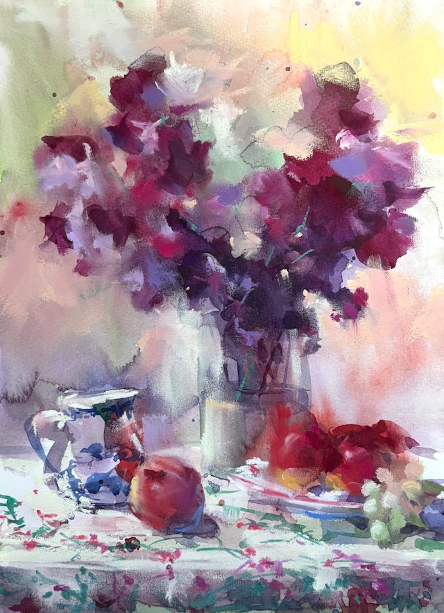 村田旭水彩/ジーザスパステル原画作品 一点もの F6 白の彫り入り アンティーク仕上げの額に入ります 額装サイズ58✖️47センチ 額装に少々お時間を頂きます もう今年最後秋薔薇 アトリエの庭から 多少形が悪いけど 香り高くなんとも品がありました 早速 姫林檎やラム酒の入ったポットと あしらうと 遠くから軽やかな音楽が流れてきました 今日は祭りの前夜祭